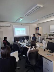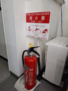 当日は映像を全員でみて、消火器の設置場所、使用方法などの確認や避難経路の確認をし、